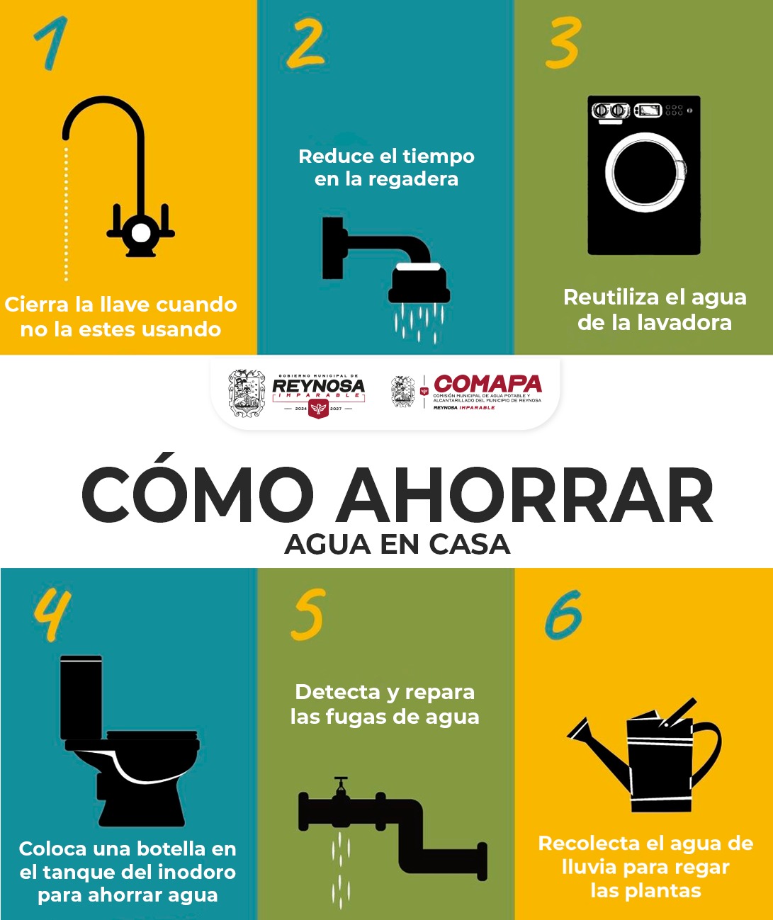 La Comisión Municipal de Agua Potable y Alcantarillado (COMAPA) de Reynosa hace un llamado a la ciudadanía a tomar acciones cotidianas que permitan ahorrar agua en el hogar y contribuir al cuidado de este recurso vital, especialmente ante la temporada de escasez de agua que atraviesa nuestra región.