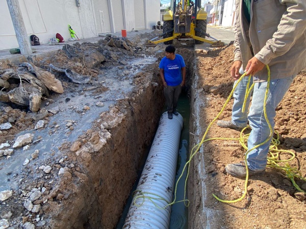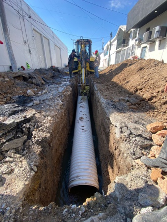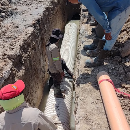 En estas acciones se lleva a cabo el reemplazo de 110 metros lineales de tubería obsoleta por ductos de PVC de 24 pulgadas de diámetro, con la finalidad de garantizar el óptimo funcionamiento del sistema de drenaje en este sector, brindando un servicio más eficiente a los usuarios.