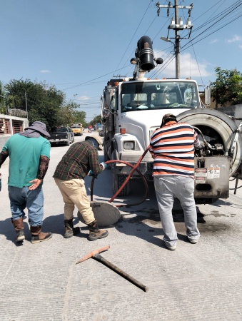 El personal del organismo realiza maniobras de sondeo y limpieza de pozos y de la línea general de drenaje sanitario, con el objetivo de disminuir los altos niveles de agua que se han presentado en distintos puntos de la colonia.