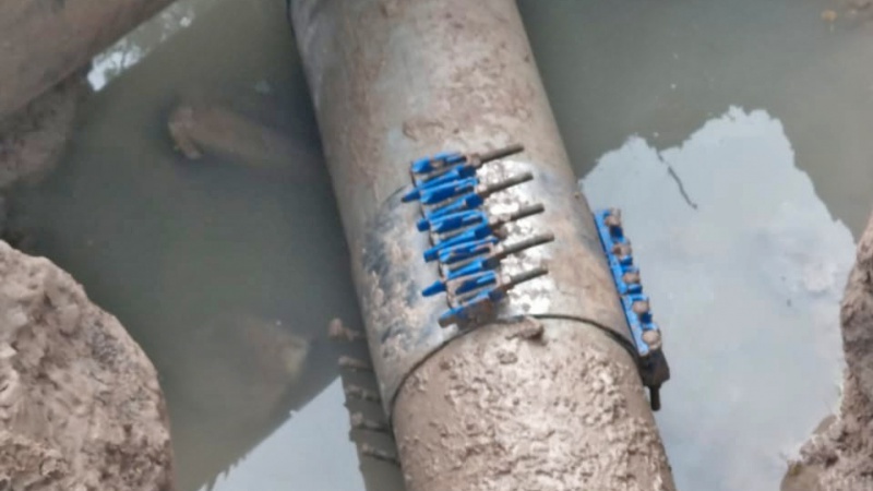Después de bajar el nivel de agua residual en la calle Calandrias, se instaló una abrazadera especial de 16 pulgadas de diámetro en el tubo de descarga sanitaria.