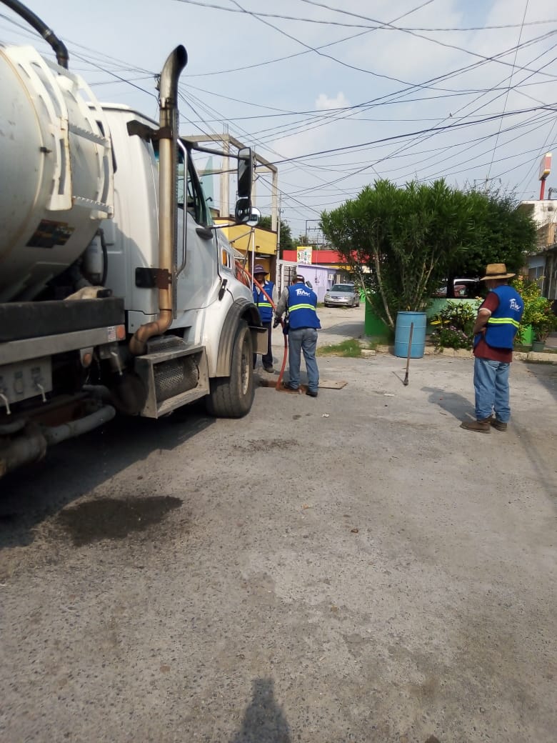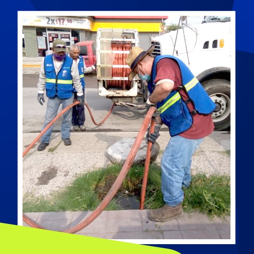 Para bajar el nivel de agua residual en la avenida Elías Piña con 14, se trabaja en la limpieza del drenaje sanitario ubicado en la calle Marruecos, en la colonia La Cañada.