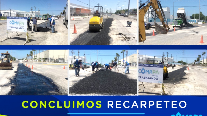 Con la aplicación de asfalto en 159 metros lineales de la calle Falcón, concluye la reposición del pavimento donde se rehabilitó un caído, en el Parque Industrial del Norte.