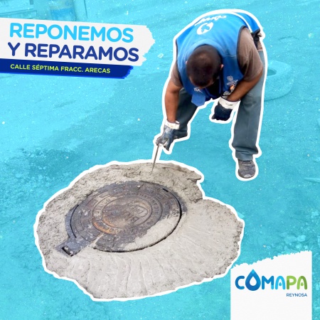 Reparamos brocal en calle Séptima con Margarita Maza de Juárez en el Fraccionamiento Arecas y repusimos tapa de la alcantarilla para evitar que el pozo de visita se vuelva a llenar de basura provocando taponamientos en la red sanitaria.